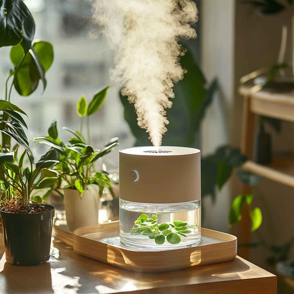 실내 식물 습도를 가장 간편하게 조절할 수 있는 도구는 바로 가습기입니다. 특히 건조한 겨울철이나 난방기가 가동되는 환경에서는 실내 습도가 급격히 떨어지기 때문에, 가습기를 적극적으로 활용하는 것이 식물의 건강을 유지하는 데 큰 도움이 됩니다. 하지만 모든 가습기가 식물에게 적합한 것은 아니에요. 일반적으로는 초음파식 가습기보다는 자연기화식 또는 복합식 가습기가 식물에게 더 안전한 것으로 알려져 있습니다. 초음파식의 경우 물속에 포함된 미세한 석회질, 세균, 곰팡이 포자 등이 함께 분사될 수 있기 때문이에요. 특히 식물 근처에 두는 가습기는 정기적으로 세척해줘야 하며, 물은 가능하면 정수된 물이나 끓인 물을 식혀서 사용하는 것이 좋습니다. 가습기를 사용할 때는 식물에 바로 닿지 않는 거리에서 간접적으로 습기를 공급하도록 배치해 주시는 것이 좋으며, 가습기 방향은 식물 바로 앞보다는 공기 순환 방향을 고려해 약간 옆으로 틀어 두는 것이 안전합니다.